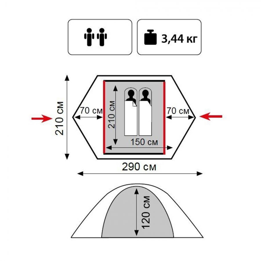 - Размер внутренней палатки ДхШхВ, см: 150 х 210 х 120