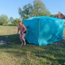 - Устанавливать тент для бани походной рекомендуется вчетвером.