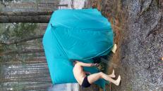 - Завернуть стенки тента вверх, занести тент над грудой нагретых камней и аккуратно опустить стенки, оттянуть верхние оттяжки и надежно закрепить колышками, подвязать к стойкам нижние оттяжки.